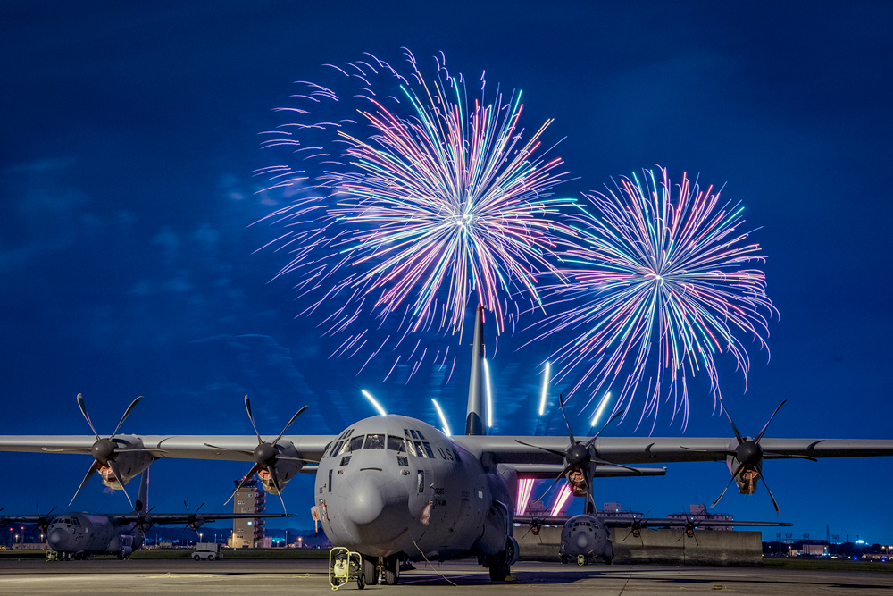 A C-130J Super Hercules rests on the flightline under a fireworks display, July 3, 2018, at Yokota Air Base, Japan. Fireworks were part of the Celebrate America festivities which also included live music, food and various activities for Yokota’s residents.