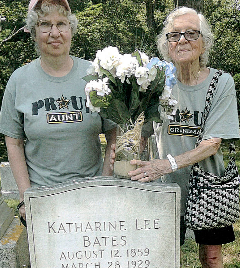 American Legion Auxiliary members Florence Falcone and her daughter, Claire Falcone, visit the gravesite of Katharine Lee Bates (author of America the Beautiful) to place an American flag at Bates’s headstone each year.